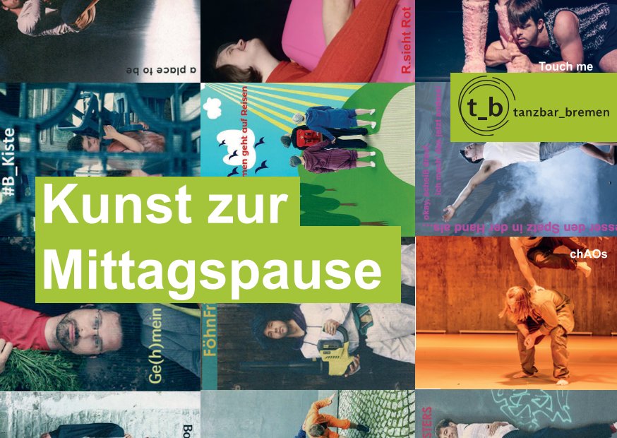 Kunst zur Mittagspause Mach eine Pause – von der Arbeit, vom Alltag, vom Müssen. Nimm dir einen Moment Auszeit und erlebe etwas Schönes. Wir zeigen kurze Bühnenstücke. Das kann Tanz, Theater oder…